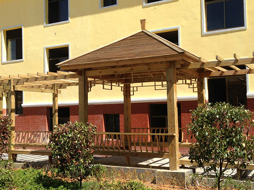防腐木的天然紋理與暖色調(diào)在視覺上也能帶來清涼感。相較于金屬或玻璃材質(zhì),木質(zhì)表面不會(huì)產(chǎn)生刺眼反光,且能吸收部分環(huán)境噪音,營造出靜謐的休憩氛圍。在潮濕的夏季,木材的調(diào)濕特性可自動(dòng)平衡亭內(nèi)濕度,避免因高溫高濕導(dǎo)致的悶熱黏膩感。